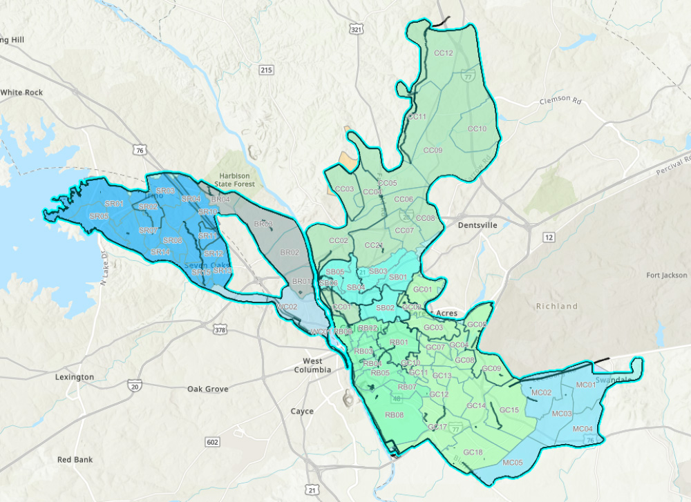 Sewer Basin: Broad River, Crane Creek, Gills Creek, Mill Creek, Rocky Branch, Saluda River, Smith Branch, West Columbia